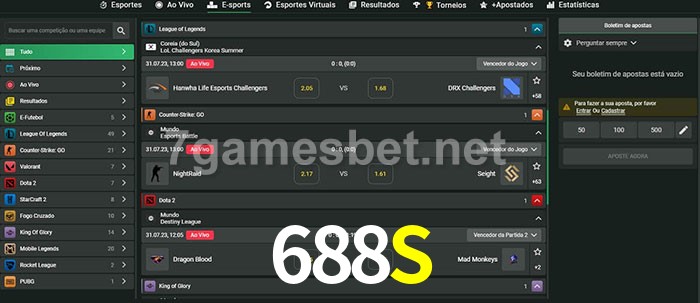 O 688S oferece uma grande seleção de opções de apostas em e-sports com probabilidades competitivas
